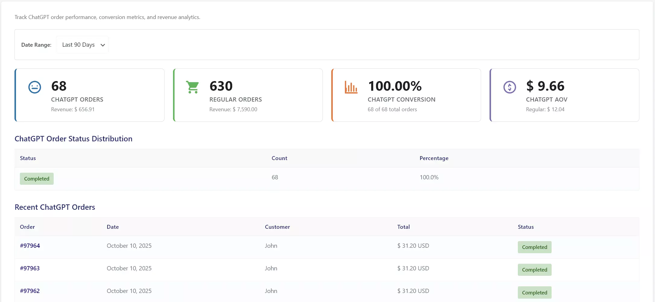 They have a special “ChatGPT Checkout” label, but otherwise, they’re normal orders. Ship them, refund them, add notes—everything works the same. The analytics let you filter them separately if you want.